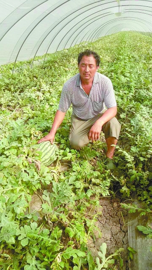 戴长庆家的160亩西瓜地,一望无际,西瓜个个饱满,已经成熟,静静地躺在地里。虽然喜获丰收,但戴长庆和妻子站在瓜地中央,无奈地摇着头。