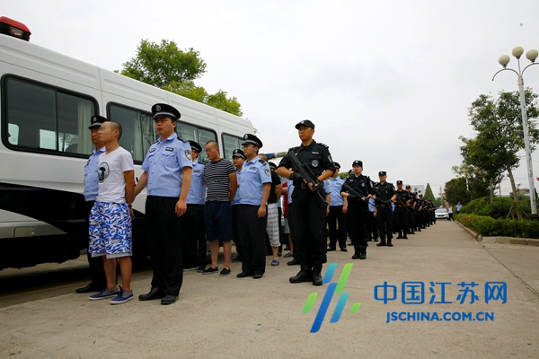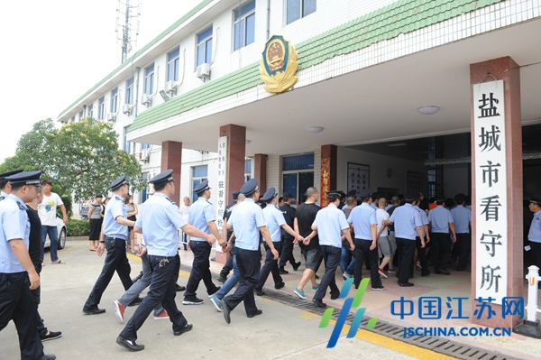 中国江苏网7月1日盐城讯(程光 王柱军 王珏 张天鹏) 6月30日上午,10辆警车在全副武装、荷枪实弹的巡特警、武警护卫下,徐徐驶入盐城市看守所,20余名犯罪嫌疑人被民警押解下车,统一收入监区。当日上午,盐城市县公安机关联动组织开展集中押解行动,将在“黄海七号”集中统一行动中抓获的犯罪嫌疑人集中押解至监管场所。