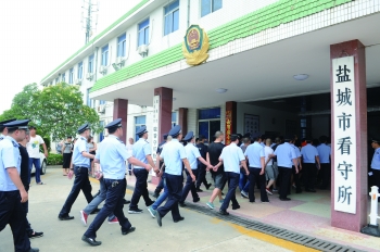 中国江苏网7月3日讯 6月30日上午,10辆警车在全副武装、荷枪实弹的巡特警、武警护卫下,驶入盐城市看守所,20余名犯罪嫌疑人被民警押解下车,统一收入监区。当天上午,盐城市县公安机关联动组织开展集中押解行动,将在“黄海七号”集中统一行动中抓获的犯罪嫌疑人集中押解至监管场所。