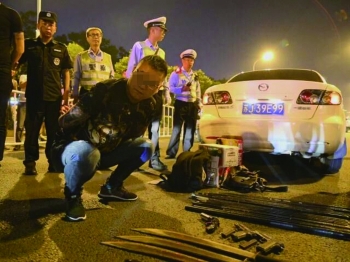 砍刀9把、红缨枪7根、钢管10根、疑似仿真枪3把,6月28日晚,市公安局交警支队六大队在盐马路与鹿鸣路交叉口设卡盘查,在一辆白色汽车后备箱查获一批管制器械,3名犯罪嫌疑人被当场控制。