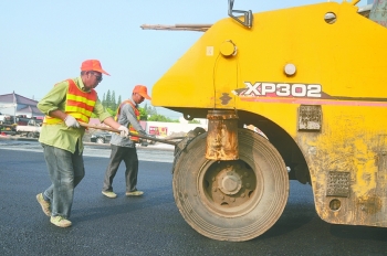 在这里工作,矿泉水大量供应,随便喝。“几个小时喝掉七八瓶水不算多。”王顺说,哪怕是冬天,在沥青摊铺现场就跟夏天一样,夏天打上一个鸡蛋很快就能烤熟。沥青摊铺机摊铺过后,钢轮压路机和胶轮压路机就会跟着上。“胶轮压路机后要随时跟着工人,用色拉油兑水刷轮子,否则沥青粘在轮子上,再压过路就不平了。”记者看到,刚刚跟着胶轮压路机刷过油后,两名工人的脸上汗珠直往下滚,他们大口喘着气。