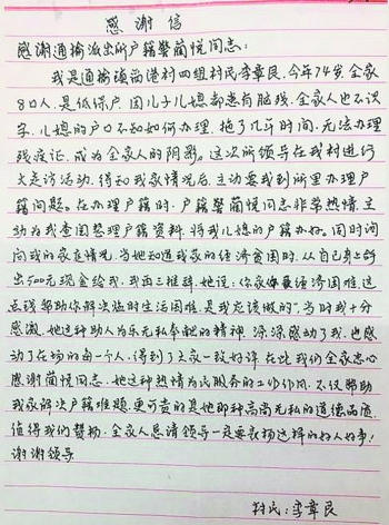 中国江苏网8月15日讯 夏季高温是永远谈不完的话题,然而对于滨海县通榆镇舀港村村民李章艮一家人来说,这个夏天,感觉到更多的是人间温暖,因为在当地派出所两位女警接力相助下,其儿媳妇戴某多年的户口问题得到解决。一家人非常感谢通榆派出所热心肠的好民警。上周五,李章艮特意请人代写了一封感谢信送到滨海县公安局。
