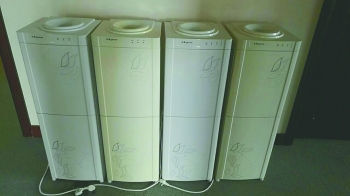 这4台柜式饮水机是以往办公室的工作人员使用的,后来买了新的,旧的用不到了。饮水机是沁园牌的,分温热水,当时购买时不便宜。“饮水机擦洗过后,看上去还挺新,大约有六成新,都是白色的,上下各有一朵印花。”徐银春介绍道。