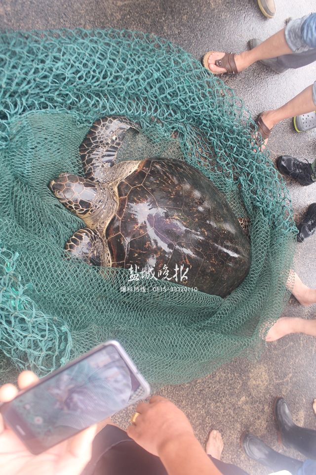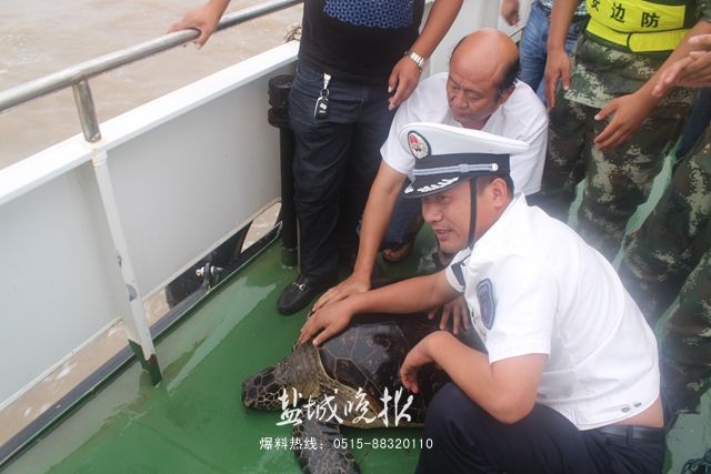 9月11日中午12时30分,东台海洋滩涂与渔业局工作人员、渔民代表、动物保护志愿者及渔政执法人员乘坐中国渔政32532船,将绿海龟送往弶港以东约10海里处放生。“那里有深槽,深约8~10米,适合放生。”东台渔政监督大队副大队长叶荣说。