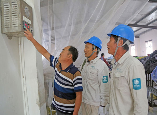 中国江苏网讯 9月11日,国网东台市供电公司富安供电所员工来到富安镇智能养蚕场,检查温湿控制器、切桑机的电源线和控制设备,向智能养蚕场主了解秋蚕温湿用电情况及供用电需求,保证蚕农秋蚕养殖用电无忧。