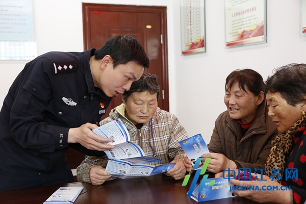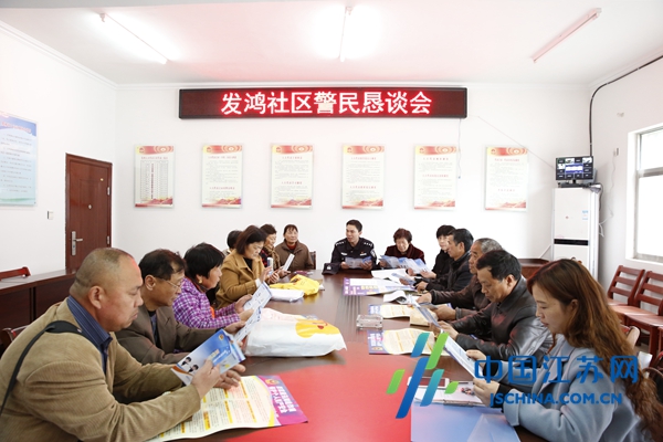 此时的发鸿社区居委会里坐满了居民代表,据社区主任陈惠介绍,居民代表当中,有一大部分都是社区的“网格长”,他们既是居民又是民警的好帮手,社区里发生的大小事都能及时掌握到,一旦有治安隐患发生,也能第一时间向社区民警通报。随着何振荣的到场,会议室里突然热闹了起来,“何警官,你那自行车也该换换了,都旧成什么样子。”67岁的王如德的一句话逗乐了所有人。“还能再蹬蹬。”何振荣操着一口射阳话打趣道,现场一片欢笑。趁着这个档口,何振荣将手上的反诈骗宣传资料挨个发了一遍,宣传资料图文并茂,各种诈骗手段和防范知识一目了然。“给我10份,邻居们都托我带回去学习学习。”“给我来5份,我那边有邻居最近老是接到诈骗电话。”……何振荣忙不迭地一边分发资料,一边提醒居民们注意防范。