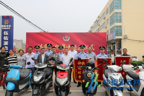 中国江苏网6月4日盐城讯(张天鹏 王一伟)孟夏时节,栀子花开。5月28日上午,盐城市公安局城南新区分局伍佑派出所的办公楼前聚满了满脸欢喜的市民,门口整齐地摆放着十余辆电动车、自行车。