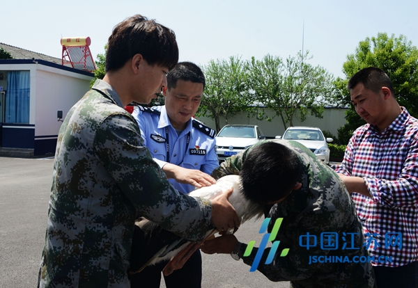 就在前一天晚上,沿河派出所接群众报警称,在自强村一藕塘内发现一只东方白鹳,陷于泥泞中,动弹不得,疑似受伤。杨云和民警赶至现场,卷起裤脚下水,并在村民帮助下,合力将“大鸟”救起。带回派出所后,杨云与盐城国家级珍禽自然保护区进行了联系,请他们抓紧时间过来救治。5月20日上午,他们在向阳村一处养殖水面上,也曾救起一只受伤的东方白鹳,并移交给了保护区。