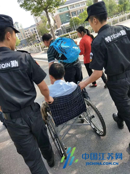 中国江苏网6月16日盐城讯(程光 袁祥梅 曹锦文)今天上午,盐城市中考正式开考。在江苏省射阳中学考点,一名考生由于腿部受伤,坐着轮椅来考试。因其考场设在5楼,几名巡特警大队队员帮忙将考生一直抬上5楼,护送进考场。