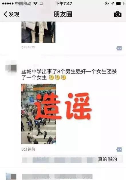 中国江苏网11月26日盐城讯(张天鹏 王一伟)近日,网上流传着一条耸人听闻的消息:“盐城某中学,8个男生强奸一个女生,还把这个女生杀了”。该信息被大量转发,一时闹得人心惶惶。