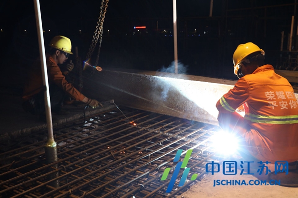 21日23时30分,十几名工人在有序忙碌着,为浇筑混凝土做准备。“因为连续梁横跨盐淮高速公路,施工难度大、风险高,我们对安全工作非常重视。连续梁施工过程中,项目部多次召开施工专题分析会,针对有可能出现的问题提前采取预防措施,重点加强了难点部位和关键环节巡查,并严格执行领导带班制、旁站制、夜间巡查等制度,确保了该工程安全质量始终受控。合龙前,仔细检查了各个零部件以及挂篮。”盐通铁路一标一分部技术主管黄健介绍。