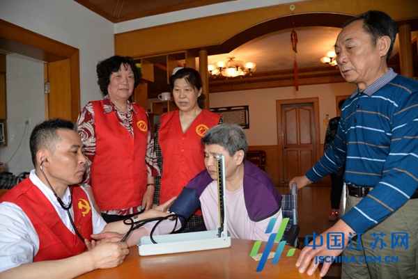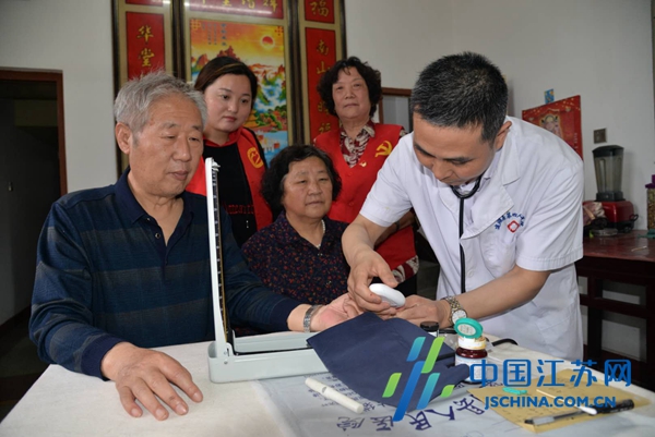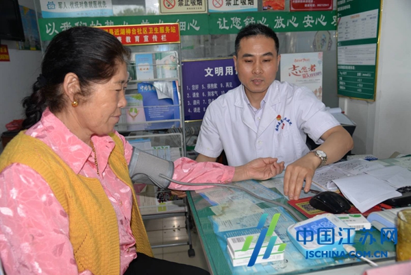 中国江苏网5月30日盐城讯 5月27日,初夏的风夹着雨,淅淅沥沥下个不停。风雨中,一个穿着白大褂、身背药箱的清瘦男子,与10多名身披鹅黄色工作服的社区志愿者一起,穿梭在建湖县城神台社区的大街小巷,叩开了一扇扇门,为残疾人、五保户和那些需要帮助的老人们,测血糖、量血压、拉家常,嘘寒问暖……