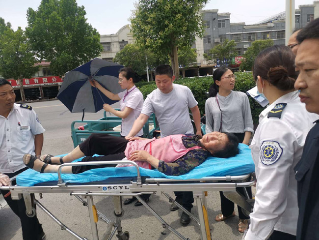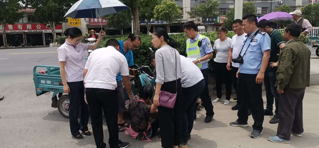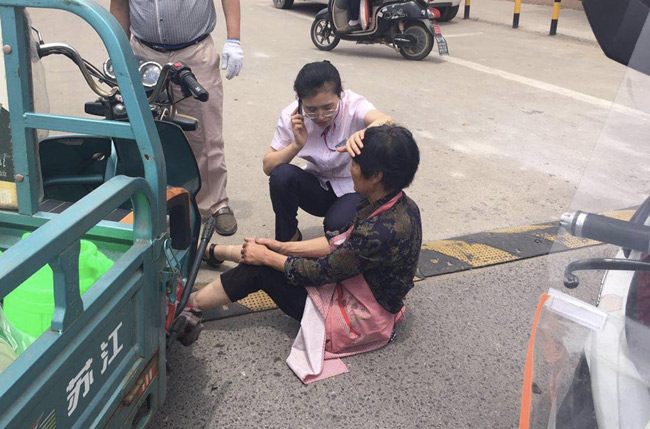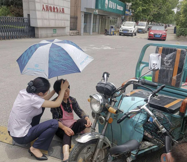 由于事发中午,气温高达31℃,在等候救护车过程中,因为担心老人会被地面烫伤以及暑热会加重伤势,徐敏的同事王丹丹连忙从供电公司门卫室找来一把遮阳伞,徐敏立即接过蹲下身子为老人撑起,并为老人捂住伤口。老人腿已不能动弹,头上也鼓起了核桃大的一个包,由于估摸不准自己的伤情究竟有多重,淳朴的老人一边不停地哭泣,一边一个劲地叨唠着,担心因自己受伤严重而拖累家人。事故对方驾驶电瓶车的憨厚中年男子不停转悠,一脸焦虑,想帮却不知如何下手。