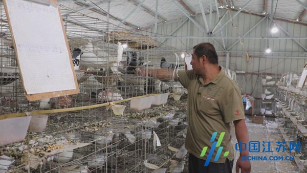 在鸽场,赵正桃正在和四五名工人一个一个笼子打扫卫生,过道上自动喂食机间隔定时移动,喂食机移动到哪里,那里两边的鸽子就伸出头来啄食。