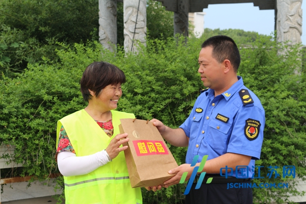 姜冬清是一名普通的城管队员,但他有一颗助人为乐的心。他还多次组织爱心人士慰问军烈属、孤寡老人、贫困学生以及其他困难家庭。去年腊八节前,他组织爱心人士给社区上百名老人送去腊八粥。今年夏天,他们组织爱心人士给街道每一位环卫工人送去香皂、毛巾、花露水、风油精等物品,让人们在炎炎夏日感受到丝丝清晾。(陈兆良)