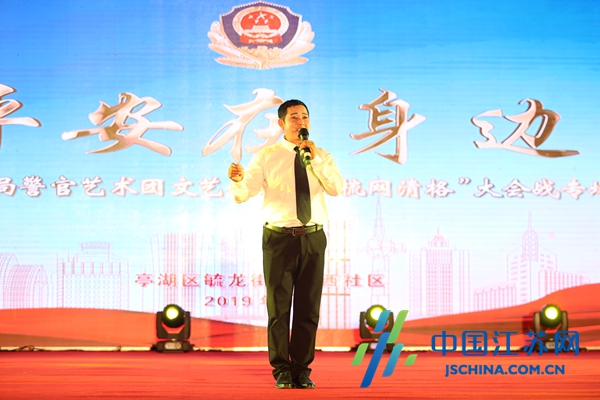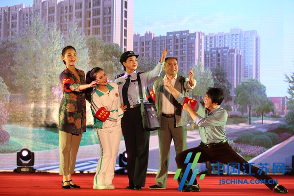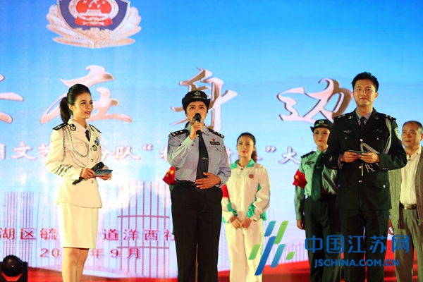 省淮剧团大院位于洋西社区,几名来自省淮剧团的演员群众,在台上用真切感人的唱腔唱道:“我认识你张警官已多年,你推广梳网清格一天天!发动群众把队伍建,群防群治抓得严。你白天巡防夜查点,接警从速不拖延。火眼金睛识罪犯,百姓平安担在肩。做了好事一件件,警民一家,才迎来岁月艳阳天!”