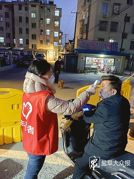 “您好,别忘了佩戴口罩,不要聚集、聚餐,只要疫情一天没有结束,我们都要做好防控工作。”2月22日晚8时许,正在东台市东坝小区门口执勤的梅蕴丹一边向过往行人宣传防控知识,一边忙着帮进入小区的市民测量体温。当天本该在家休息的梅蕴丹,把两个年幼的孩子交给丈夫和公婆照顾,执意来到执勤点坚守在防控一线。