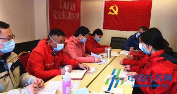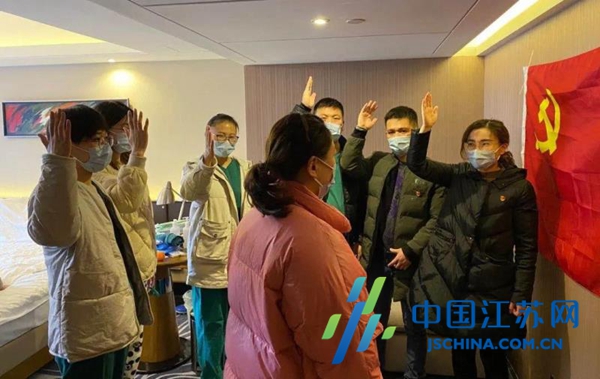 中国江苏网2月25日盐城讯 2月24日,全部顺利通过培训考核的盐城市响水县参加第八批江苏援武汉医疗队15名队员召开进入病房前的最后一次集体会议,其中6名党员和1名预备党员面对党旗庄严宣誓。