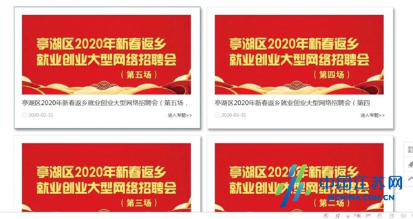 中国江苏网3月10日盐城讯 3月4日,从盐城市亭湖区人社局了解到,截至目前,该局已分五批次为208家企业搭建网上招聘平台,累计发布就业岗位8107个,求职者在线点击浏览量2.3万人次,达成初步就业意向992人。