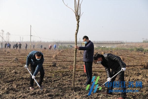 中国江苏网3月13日盐城讯 又到春回大地、芳草吐绿的植树好时节。3月12日上午,盐城市生态环境局党组书记、局长崔庆明率领导班子及科室负责人十余人来到东台市惠阳路高铁道路旁,挥锹培土,栽下新苗,响应2020春季全民义务植树活动。