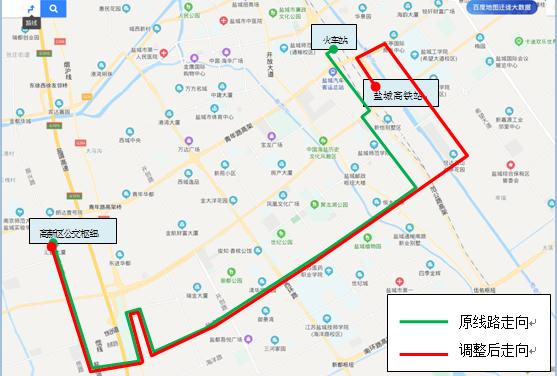89路原走向:火车站、范公路、世纪大道、新园路、盐渎路、良友路、新都路、新204国道、盐渎路、振兴路、高新区枢纽,拟调整为:盐城高铁站、运河路、青年路、天山路、盐渎路、良友路、新都路、新204国道、盐渎路、振兴路、高新区枢纽。