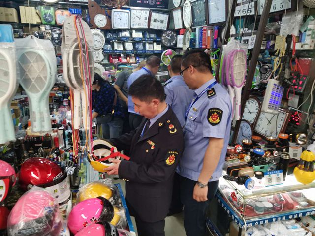 市场监管人员在阜宁小商品市场检查头盔销售情况。(盐城市市场监督管理局供图)