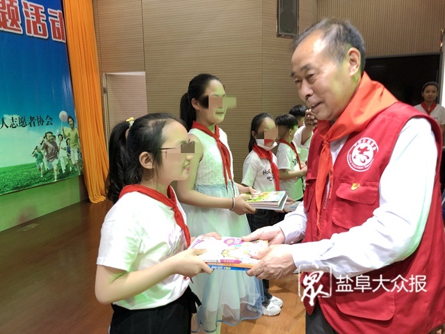 图为志愿者给孩子们赠送图书。 盐阜大众报报业集团全媒体记者 宋晓华 摄