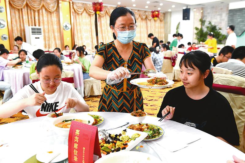 在不远处的盐城饭店食宿点餐厅内,龙冈中学的考生正在就餐。该校副校长董红干戴着口罩、一次性手套,给考生挨个分餐。董红干告诉记者,出于疫情防控的需要,该食宿点考生就餐采用错时分餐制,并且为考生分餐的工作全部由校长和教师承担。