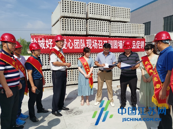 好人爱心团队在江苏润固环保科技公司阜宁厂区向首批招入困难家庭20名上岗员工代表佩戴“大红花”旨在增强脱贫致富荣誉感。好人团队采购一批西瓜和矿泉水向车间一线工人“送清凉”,同时向该厂8户特困职工家庭赠送慰问品。当他们了解到因雨季墙板产品销售不畅,当即现场召开“产品推销”恳谈会,开辟出多条销售渠道。当天该厂就与客商签订2万多平方装配式墙板订单,并打算用这笔钱资助更多困难家庭。