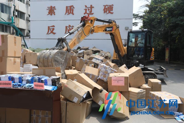 中国江苏网7月26日盐城讯 7月25日上午,随着挖土机摆臂一次次重重砸下,20余类3000余箱假酒、假烟、假化妆品等假劣产品被集中销毁,现场围观群众纷纷点赞。这是盐城警方“打假治劣”专项攻势涉案物品集中销毁仪式现场。