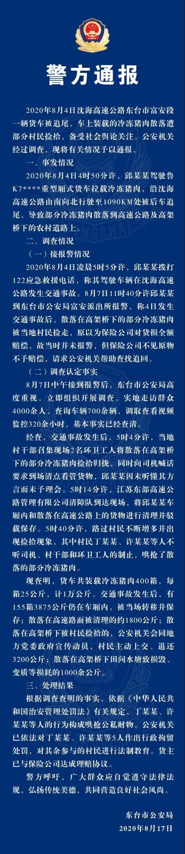 近日,一辆货车在沈海高速公路江苏东台富安段被追尾,车上装载的冷冻猪肉散落遭部分村民捡拾。8月17日,江苏东台警方就此事通报,已依法对丁某某等5人作出行政拘留处罚。