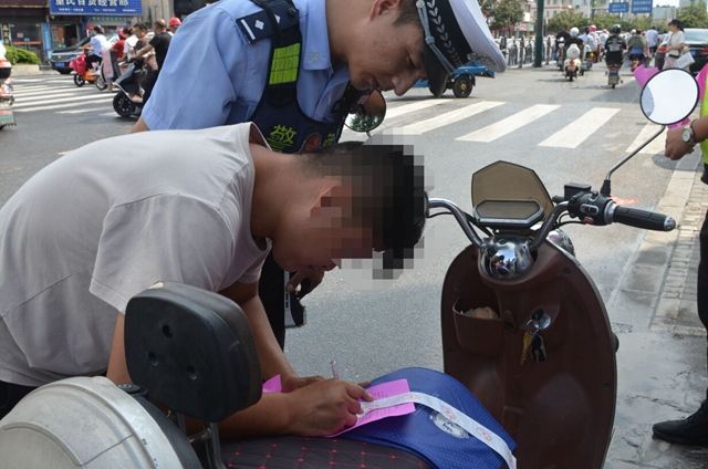 这是滨海县针对“骑行电动自行车未佩戴安全头盔”的不文明交通行为严管首日开出的第一张罚单。