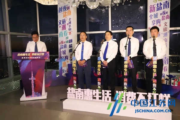 中国江苏网9月27日盐城讯 9月26日晚,盐南高新区在聚龙湖畔的盐立方广电塔上召开了“盐南惠生活·消费不打烊”系列活动新闻发布会。盐立方广电塔主塔高度195米,为城市地标建筑,透过玻璃幕墙,城市夜景尽收眼底。此次在“云端”召开史上“最高”新闻发布会,也显示出盐南高新区打响“盐南惠生活,消费不打烊”这一品牌活动的诚意和力度。
