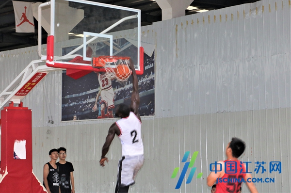 场上队员们尽情挥洒运动激情,有非洲塞内加尔共和国黑人杰克加盟的江苏永玖纸业队特别引人注目。1号队员将球投出,球擦筐弹起,刹那间,身高2米出的黑人杰克猛然跃起,上演一个漂亮的扣篮。尖叫声、呐喊声、掌声,一浪高过一浪。