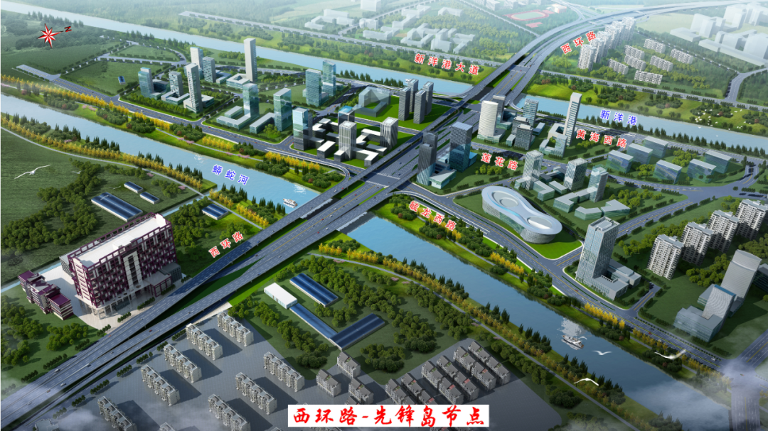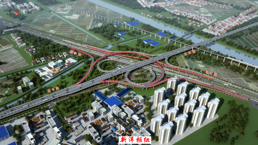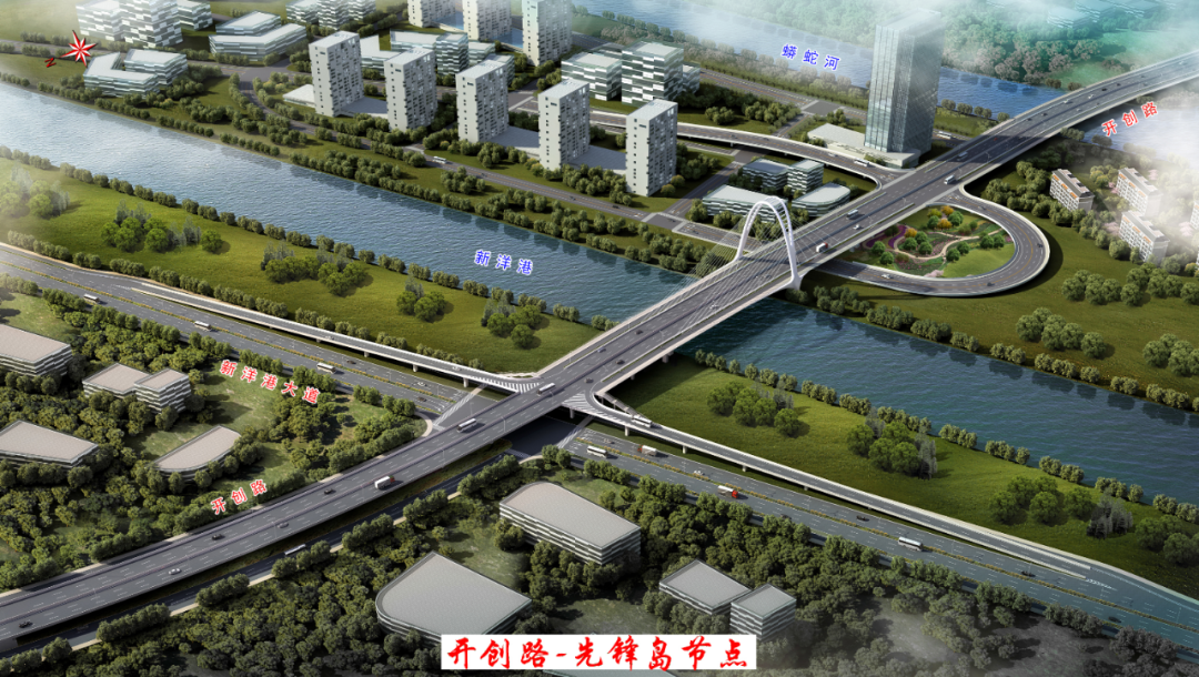 新业路-康庄大道段设计为节点上跨快速化改造,起点与新业路主线设置匝道衔接,于新洋路、新景路-沿河路节点分别设置上跨桥,终点与康庄大道主线设置匝道衔接,路线总里程约4.2公里;康庄大道-规划双元路段设计为双向6车道城市主干路,与康庄大道辅道设置平面交叉,连续上跨盐兴路、新洋港、先锋岛、蟒蛇河,与盐兴路、先锋岛设置匝道衔接,终点止于规划双元路,路线总里程约2.5公里。