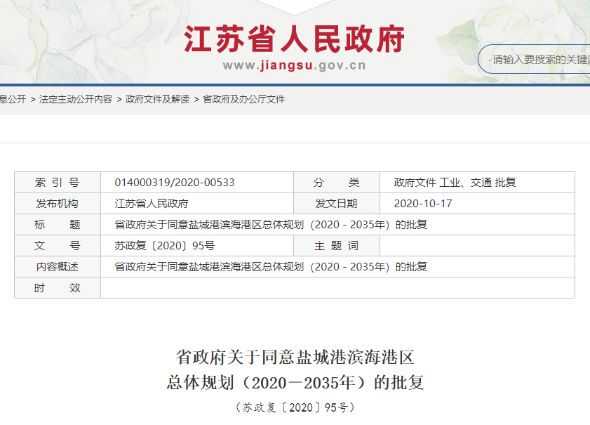 日前,省政府正式批复盐城滨海港区总体规划(2020—2035)