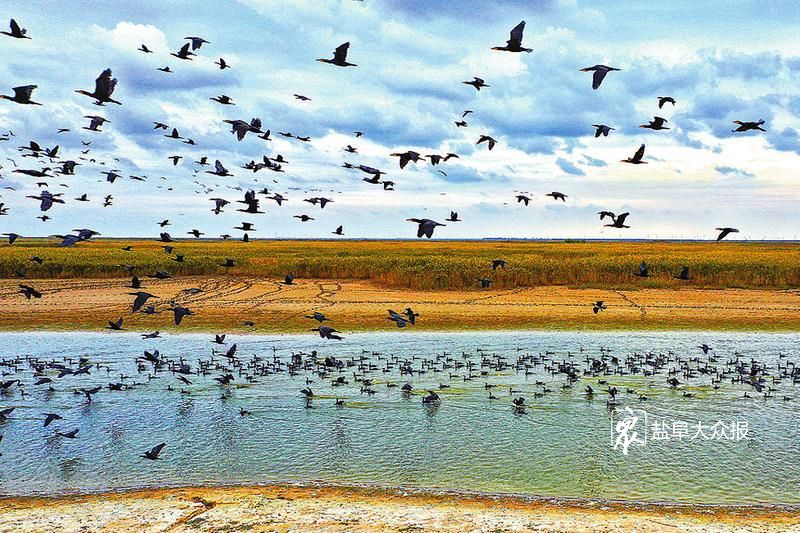 灰鹤、鸬鹚、白头鹤等鸟类聚集