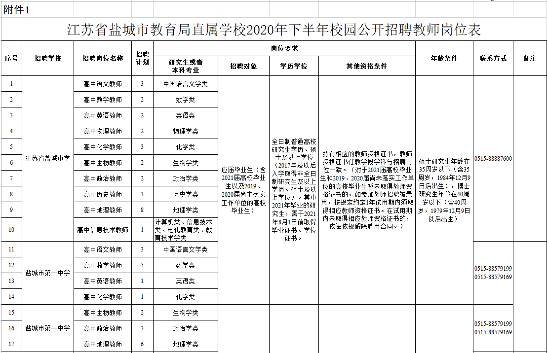附件:1.江苏省盐城市教育局直属学校2020年下半年校园公开招聘教师岗位表