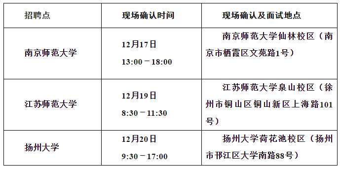 2020年12月17日开始,根据招聘岗位空缺情况依次到各招聘点进行现场确认、资格复审及面试。现场确认具体安排如下: