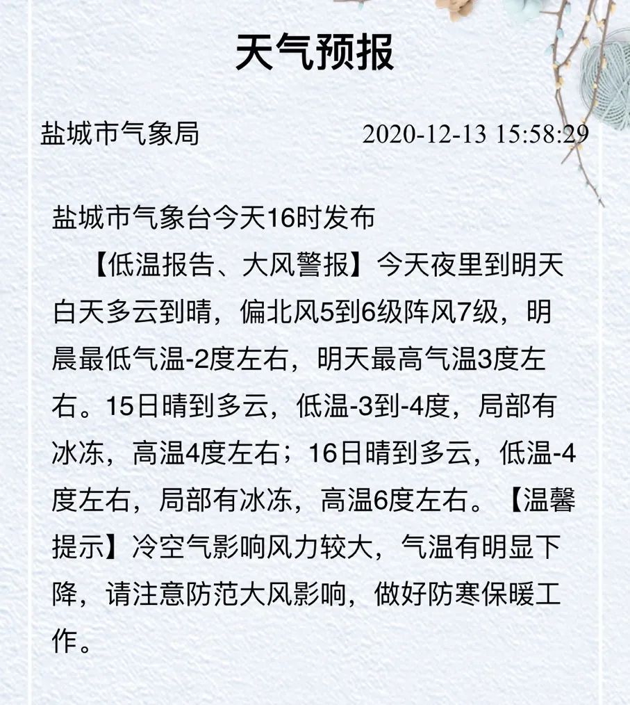 盐城最低气温将降至零度以下