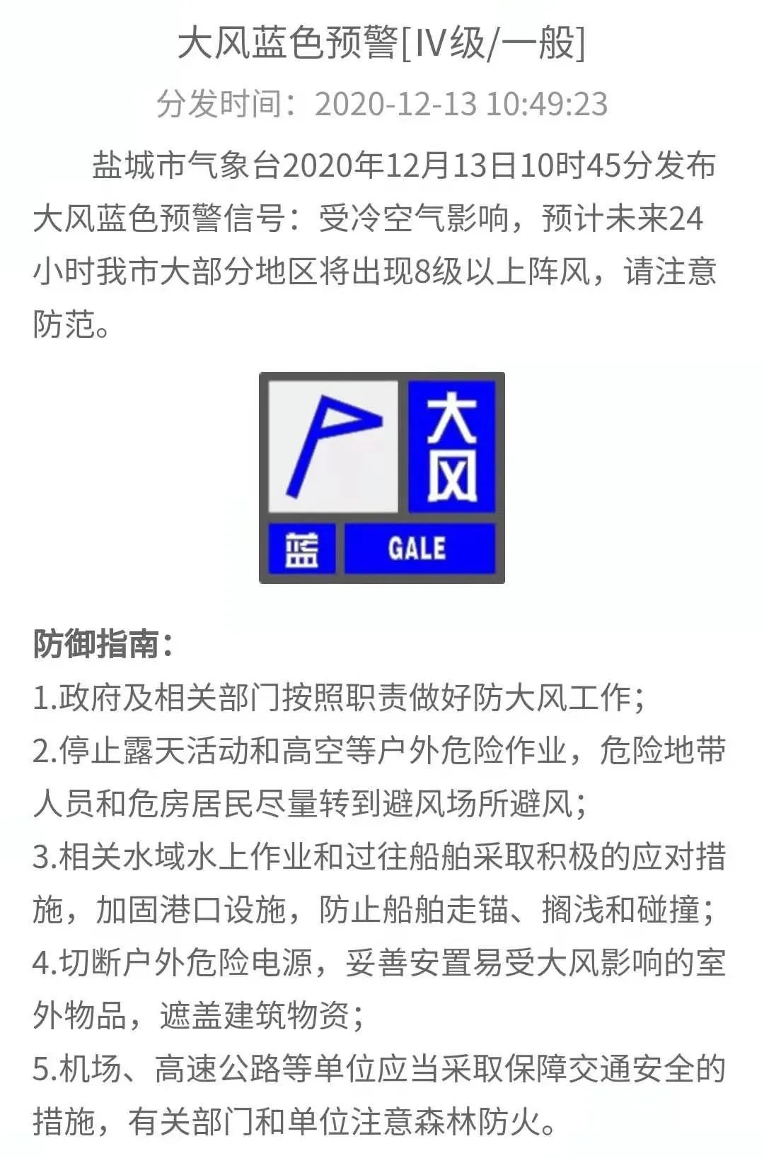 据盐城最新气象资料分析,13日一股较强冷空气自北向南影响全市,伴有大风和降温,最低气温48小时降幅5~7℃,偏北风力陆上5~6级阵风7~8级、沿海海面7~8级阵风9级。