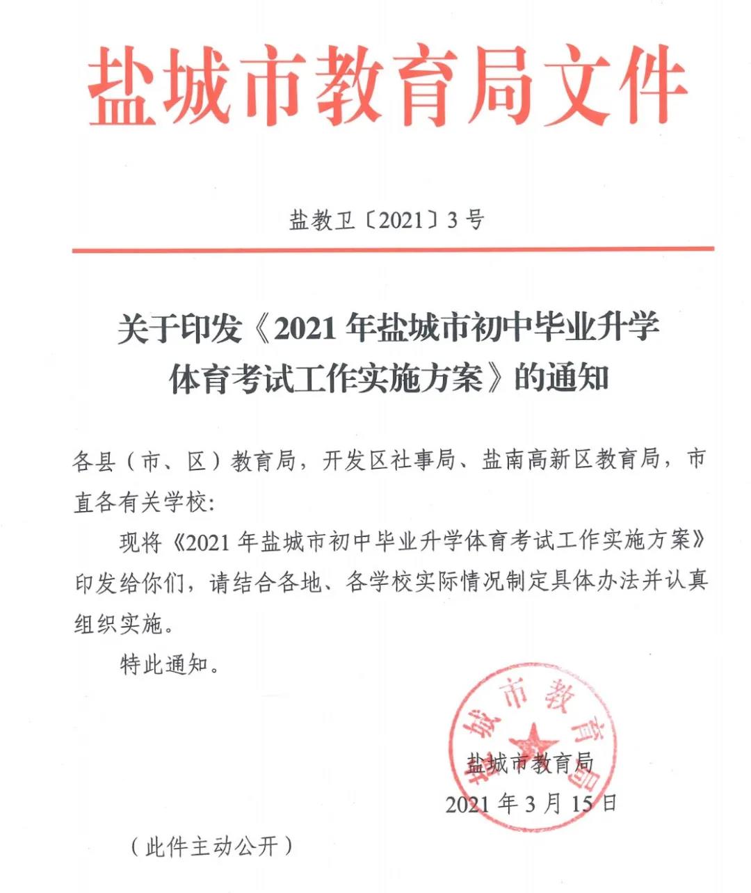 日前,盐城市教育局公布2021 年盐城市初中毕业升学体育考试工作实施方案。