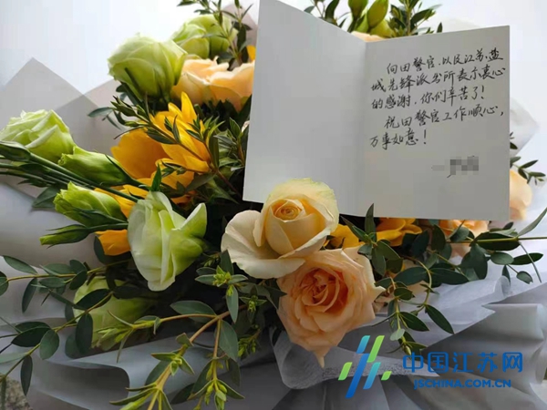 中国江苏网4月27日盐城讯 4月24日一大早,许女士手捧一束鲜花,兴高采烈地从河南老家专程赶到江苏省盐城市公安局亭湖分局先锋派出所,对帮她追回钱款的民警表达谢意。