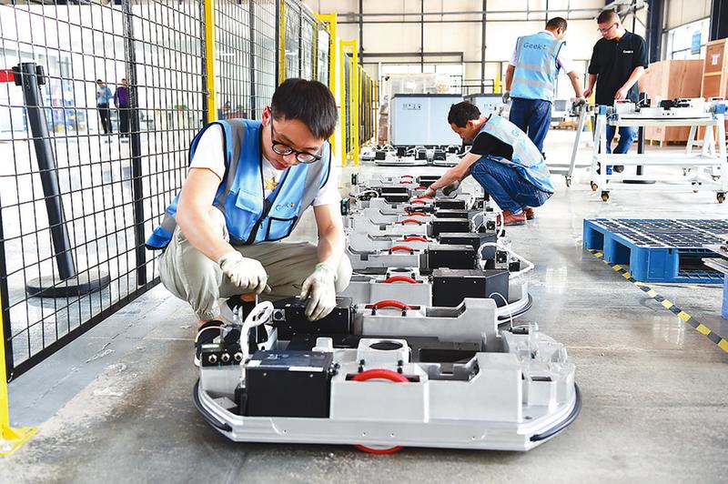 5月22日,在盐南高新区极智嘉仓储物流机器人项目生产车间,技术人员正在操控智能设备进行生产。该项目仅用5个月时间实现落地达效。项目以智能物流为切入点,利用大数据、云计算和人工智能技术,致力打造国内智慧物流AI机器人第一品牌。记者刘钟越摄