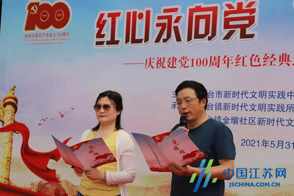 中国江苏网6月1日盐城讯 5月31日,东台市“红心永向党、‘诵'歌新时代”庆祝建党100周年红色经典巡回朗诵活动走进东台镇,市朗诵协会热情呈现《红船从南湖起航》、《党旗颂》等朗诵、合诵节目。