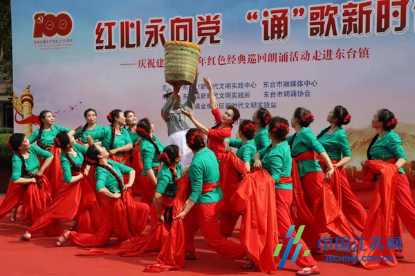 东台镇文化合作社激情登台诵读和表演《一封家书》、《我是中国人》、《串场河畔鱼水情》、《十谢共产党》等红色经典篇章和舞蹈,同时进行党史知识问答互动,将让学史明理、学史增信、学史崇德、学史力行的理念植入老百姓的心田,干群共迎建党100周年。(邹鹏安 张惠 章海南 鲍国)