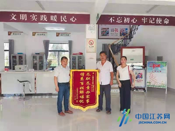 中国江苏网8月17日盐城讯 8月16日下午,盐城市射阳县长荡镇三合村六组村民董翠萍委托在盐城市区工作的女儿徐春玲来到村党总支、村委会办公室,将一面写有“情系百姓解堪忧,尽职尽责办实事”的锦旗送到党总支书记王立高和治保主任肖志干手中,感谢该村安排志愿者忙里抽闲照顾她的父母亲,还曾经救了她父亲的性命。