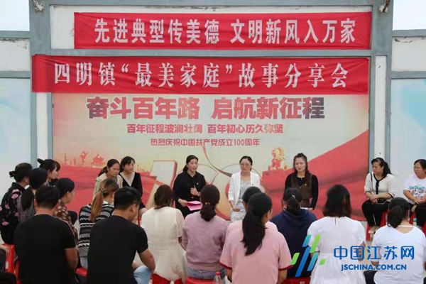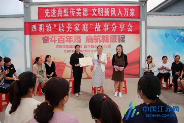中国江苏网9月10日盐城讯 “我有一个温馨的六口之家,婆媳和睦,夫妻敬爱,邻里和谐……”9月9日下午,盐城市“最美家庭”获得者顾桂芳在盐城市射阳县四明镇双六村幸福小广场上向大家展示自己的获奖证书,脸上洋溢着幸福的微笑。为推进党史学习教育走深走实,四明镇通过宣讲先进典型事迹,弘扬优良家风,传播最美家庭“好声音”,让好风尚引领社会文明,好文化滋养水绿四明。
