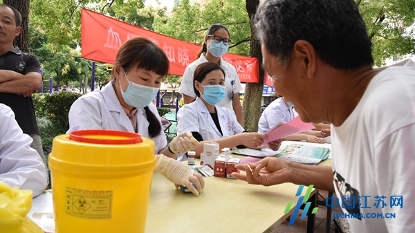 在市区金墩广场,来自东台市人民医院、市疾控中心、市三院、市二院、市四院的医务志愿者早早布置好场地,为辖区的社区居民免费开展健康义诊服务。