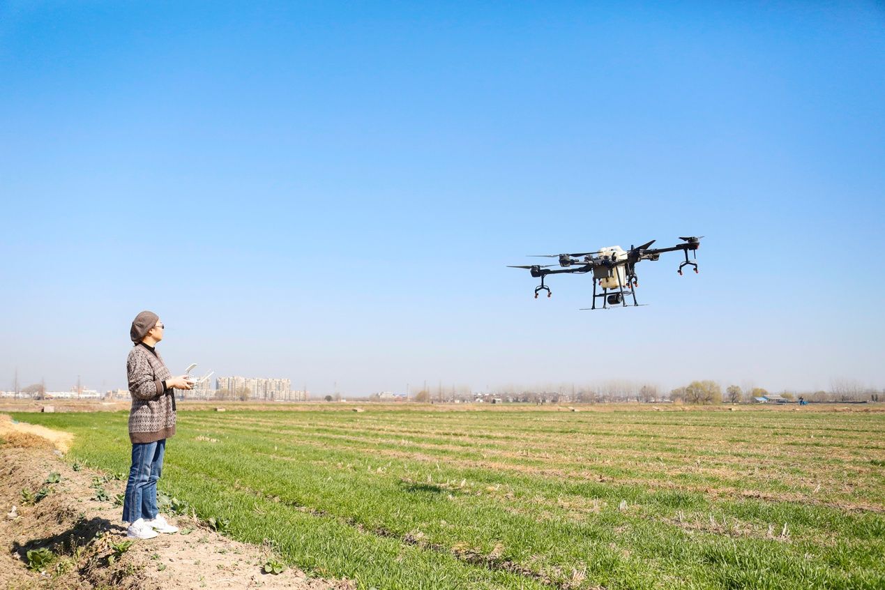 ▲吴舒涵操控无人机用药防治麦子病虫害